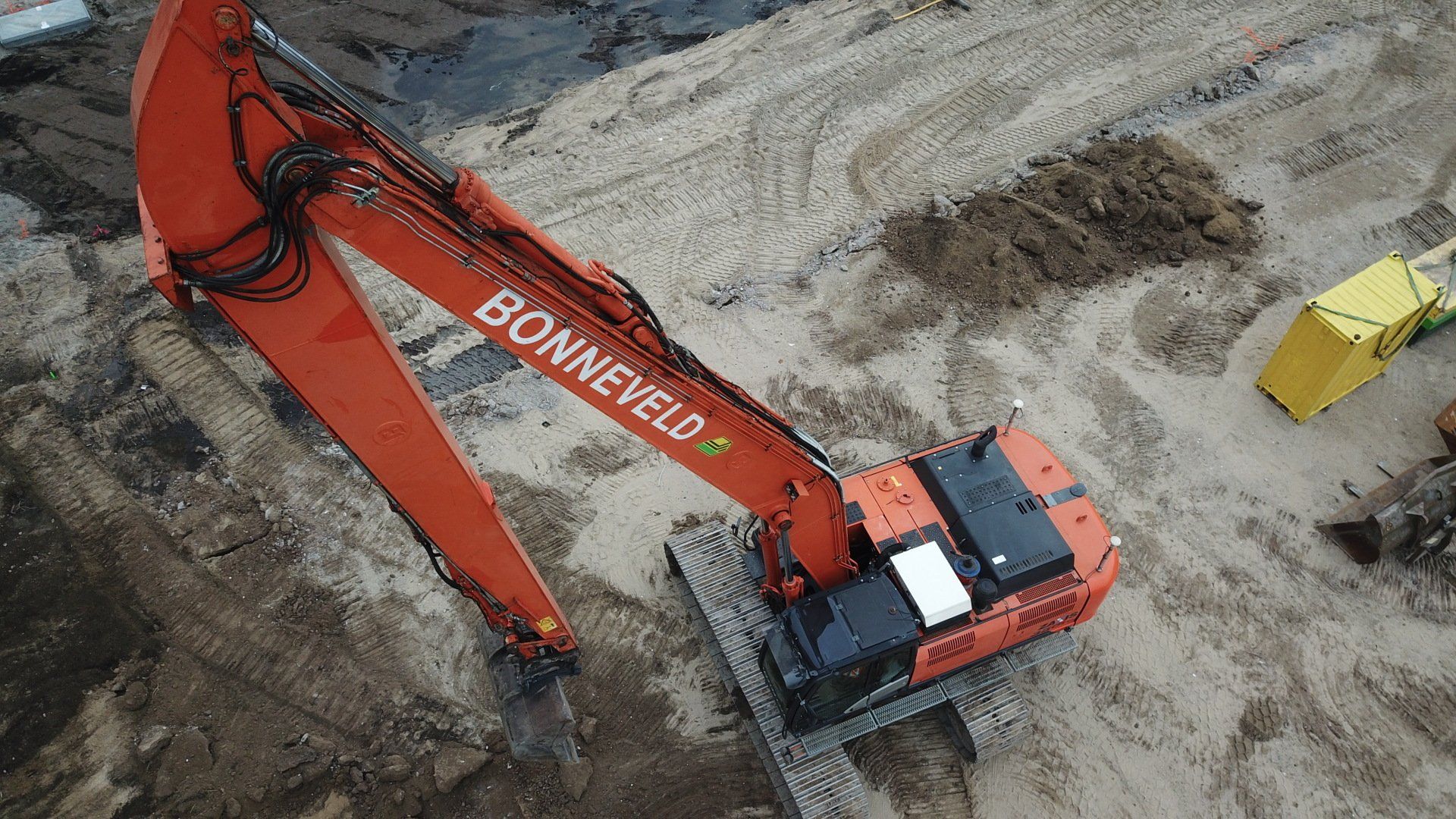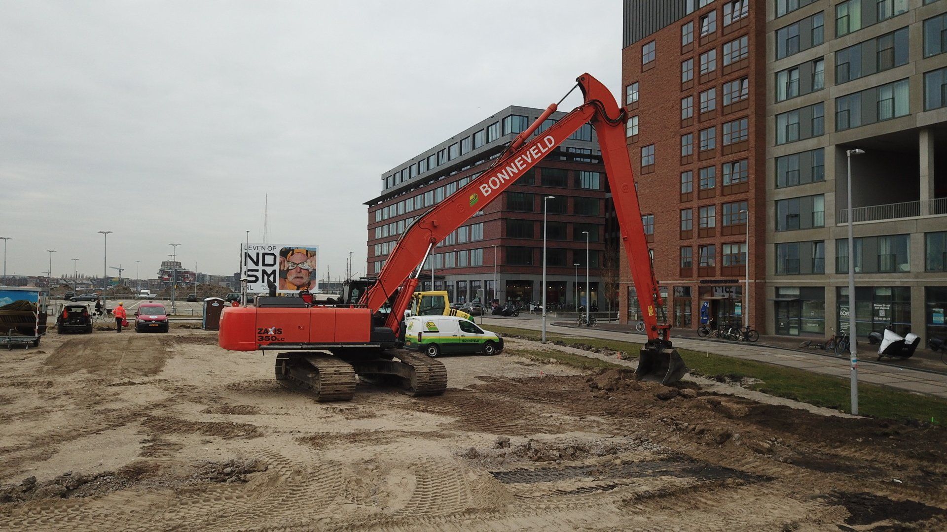 Werk met werk maken bij HIGH5 In Haarlem is gestart met de eerste fase van nieuwbouwproject HIGH5, onderdeel van gebiedsontwikkeling Schalkwijk Centrum. Bonneveld staat in voor de bouwplaatsinrichting en het ontgraven van de bouwkuip. Door een slimme fasering maakt de specialistisch grondwerker in de utiliteits- en infrabouw ‘werk met werk’ en blijft de aan- en afvoer van grondstoffen tot een minimum beperkt. HIGH5 is een ontwikkeling van HBB Groep en Hoorne Vastgoed , die gefaseerd vijf gebouwen realiseren, goed voor in totaal 569 appartementen. Voor HIGH5 hebben we nu het grondwerk van drie van de vijf gebouwen in opdracht en hebben reeds de bouwplaatsinrichting verzorgd en de toegang naar de bouwplaats gemaakt middels een grote overkluizing. Ook de bemaling valt binnen onze scope, zowel de freatische- als spanningsbemaling. Al met al voor ons dus een behoorlijk omvangrijk project. Overkluizing Rondom het bouwterrein bevindt zich een watergang. Voor een betere bereikbaarheid van het bouwterrein hebben we een overkluizing gemaakt tussen de Briandlaan en de Costa Del Sol. Daartoe hebben we begin oktober 2024 een onderheide constructie gemaakt, bestaande uit drie stalen duikerbuizen van 21 meter lang en 142 centimeter in doorsnede, gefundeerd op houten palen. Hierop is de verharding aangebracht in de vorm van 74 industrieplaten. De overkluizing zelf is met een breedte van 10 meter royaal bemeten en bedoeld voor bouwverkeer, calamiteitendiensten en bezoekers aan de sportschool in de tijdelijke huisvesting op het terrein. Het bouwverkeer wordt uiteraard gescheiden van het overige verkeer door betonnen barriers. Omvangrijke bouwplaatsinrichting Voor een vlakke en stofvrije bouwplaats heeft Bonneveld het terrein rondom vlak getrokken en afgedekt met in totaal ruim duizend industrieplaten. Aan de zijde van de Haarlemmervaart is tevens een tijdelijke damwand aangebracht en hebben we deze gedempt om voldoende werkruimte te creëren voor de realisatie van de woontorens. Verder hebben we een berlinerwand aangebracht zodat de aannemer na het ontgraven op een veilige manier de fundaties kan realiseren. Slim faseren De bouwkuip voor de eerste drie woontorens betreft een oppervlakte van een kleine 6.000 m2. Onze aanpak is erop gericht om grond zoveel mogelijk op locatie te houden. Grond wordt weliswaar op het bouwterrein verplaatst, maar later weer hergebruikt. Op die manier zijn we bijvoorbeeld in staat om de heilaag zo economisch mogelijk aan te brengen. Bij de eerste fase ontgraven we tussen de ruim 700 palen door met ons specialistische materieel uitgerust met GPS-apparatuur. Uiteindelijk moeten we 7.500 m3 grond afvoeren, maar wordt er twee keer zoveel ontgraven. Dat blijft dus allemaal op het project. Kwestie van slim plannen en faseren. Bonneveld is eind januari 2025 gestart met het ontgraven van de bouwput.
