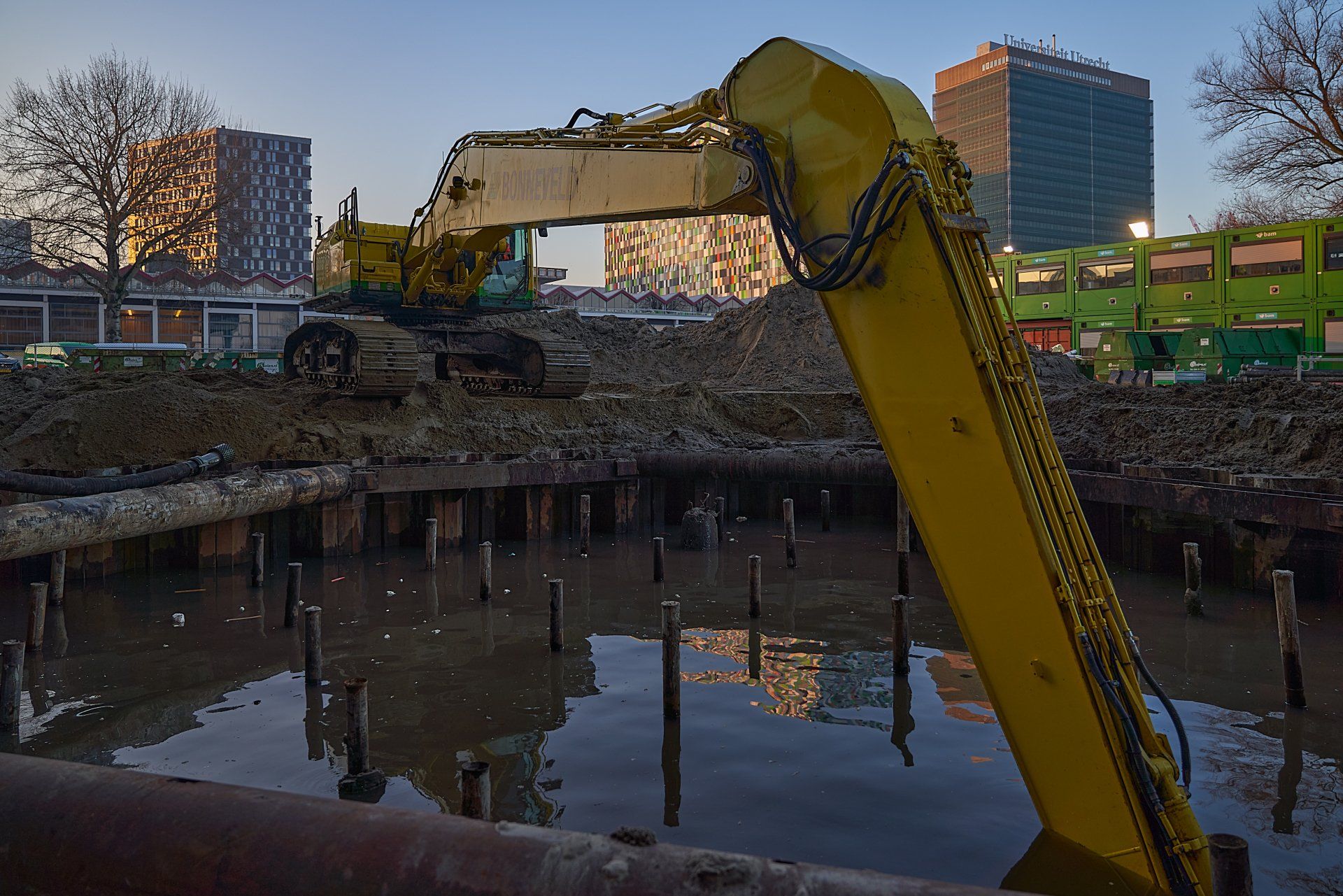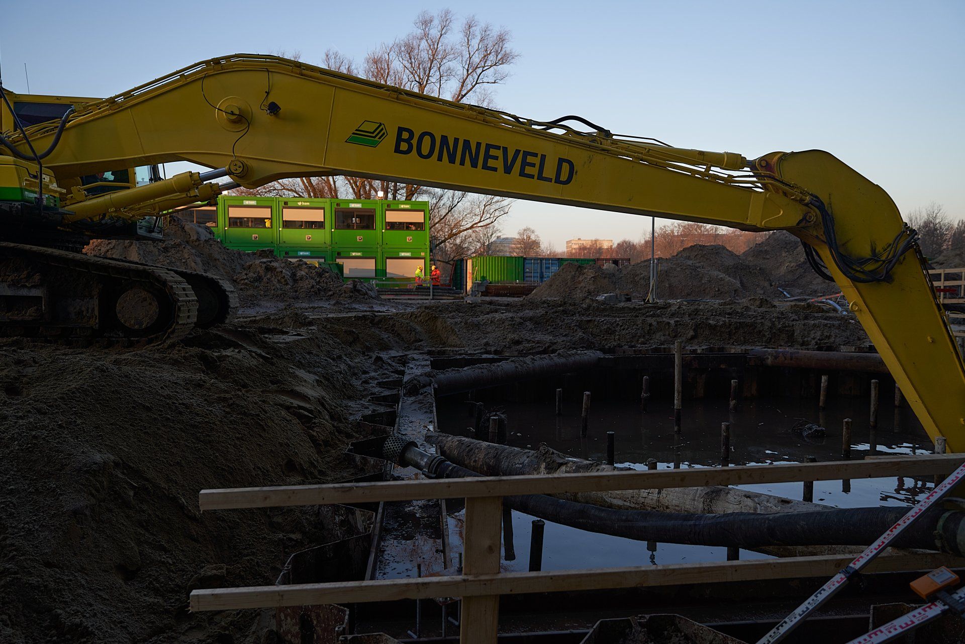 De Silo’s op Zeeburgereiland krijgen een nieuwe bestemming. Van industrieel erfgoed naar een levendige ontmoetingsplek met cultuur, horeca en een groen dakpark, Hier komt modern design samen in een duurzame toekomst. In opdracht van Vink Bouw mochten we de grondwerkzaamheden en de bouwplaatsinrichting verzorgen van de transformatie van de drie voormalige waterzuiveringssilo’s. Onderdeel van de bouwplaatsinrichting is de tijdelijke demping van een watergang om zo voldoende bouwterrein beschikbaar te maken. De transformatie van de silo’s is een project met hoge duurzaamheidsambities. Het ontwerpcertificaat BREEAM Outstanding is al binnen en ook de uitvoering ligt langs een strenge duurzaamheidslat. En Bonneveld draagt daar letterlijk en figuurlijk haar steentje aan bij, Een deel van het puingranulaat is afkomstig van een breker in de buurt, een belangrijk deel is afkomstig uit Delft van een ander werk van Vink Bouw. Aan het einde van de rit gaan we de bouwplaats weer opruimen. Puingranulaat gaat dan weer door naar een andere bouwplaats, en als daar geen plek voor is, naar de breker. Vloerplaten die goed genoeg zijn, gebruiken we ook zo lang mogelijk door. Is de bouwkeet weg dan zullen we als laatste werk de watergang terugbrengen in oude staat en met de grond het bouwterrein opvullen.