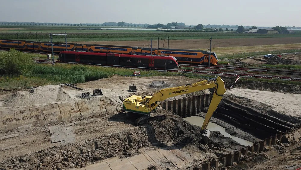 Railinfra-projecten vragen vaak om meerdere disciplines tegelijk. Denk aan het nat ontgraven van pompputten of tunnelbakken, of het aanbrengen van een paalmatras onder een spoorbaan om zettingen te voorkomen. In zulke situaties komt de brede expertise van Bonneveld volledig tot zijn recht, een belangrijke meerwaarde in complexe spoorsituaties.