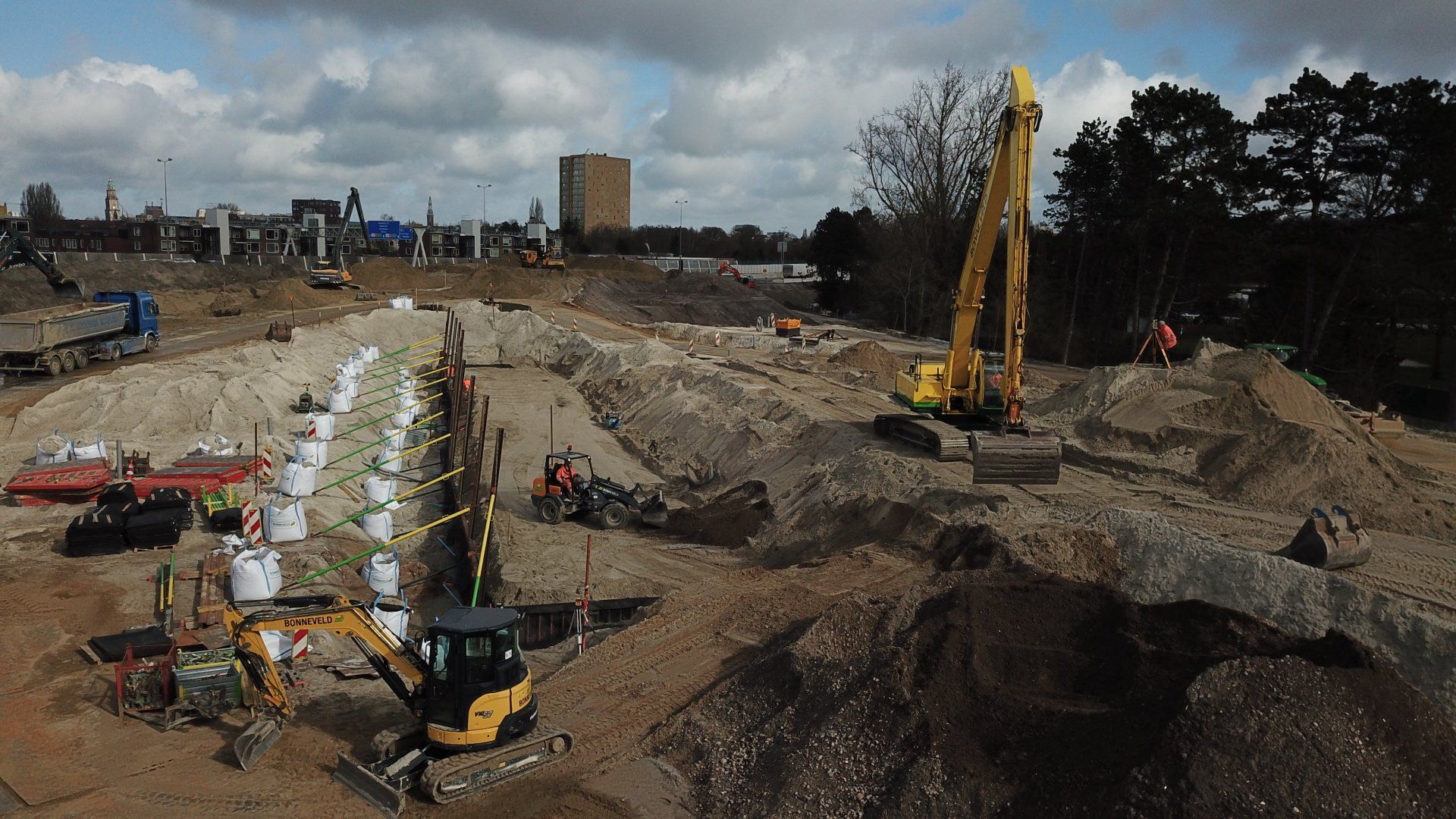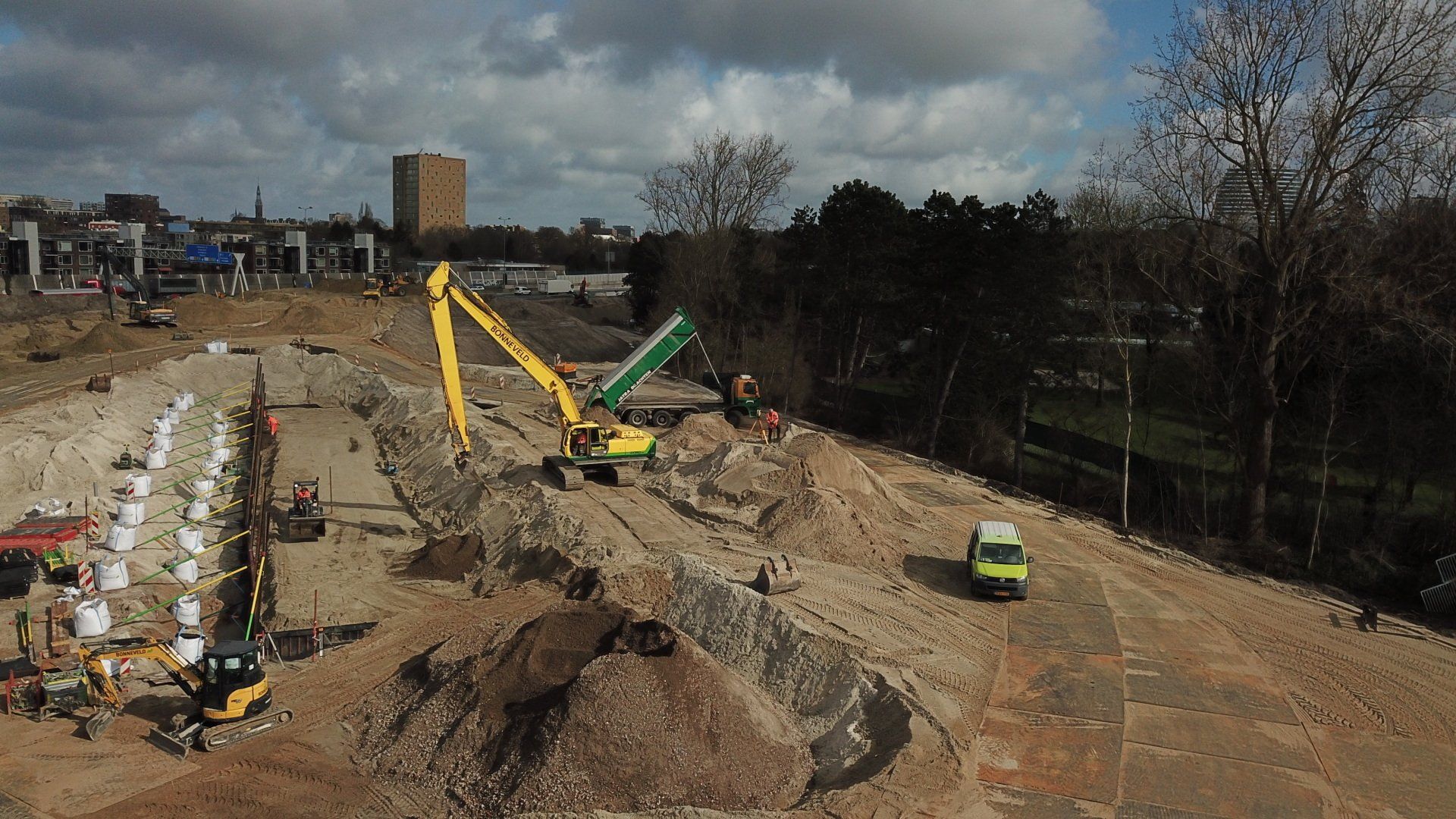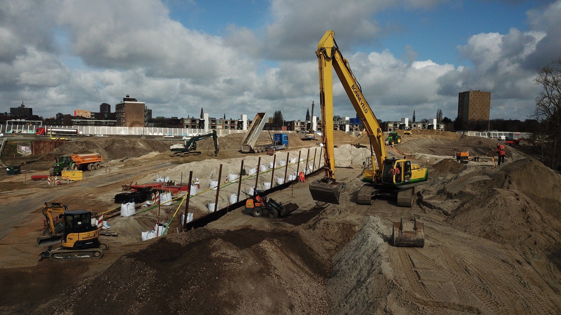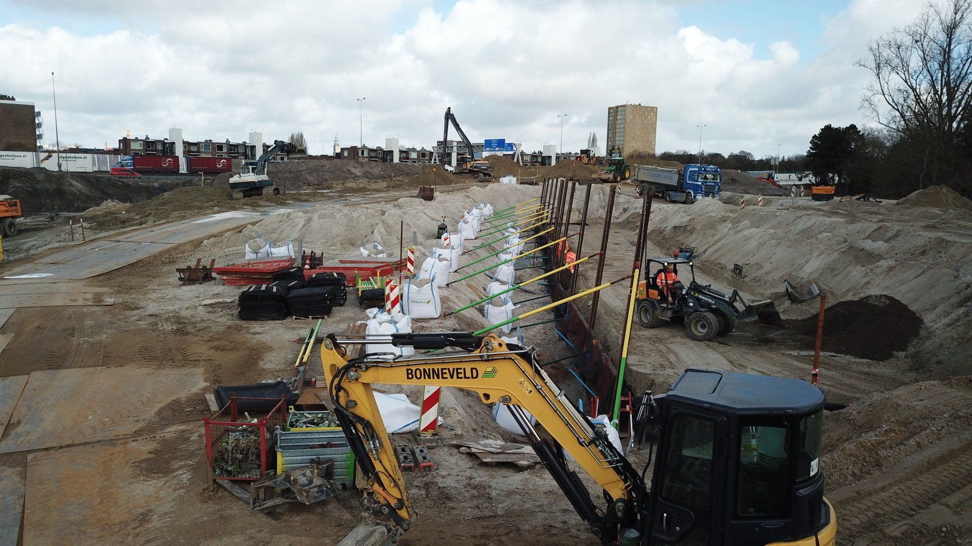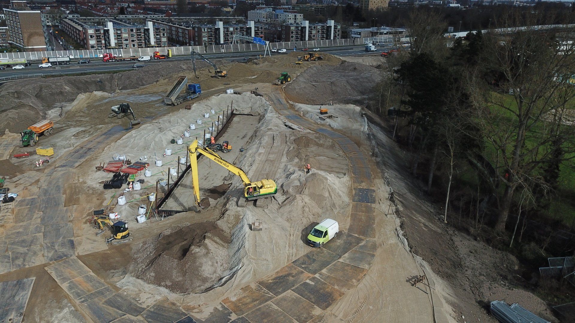 Werk met werk maken bij HIGH5 In Haarlem is gestart met de eerste fase van nieuwbouwproject HIGH5, onderdeel van gebiedsontwikkeling Schalkwijk Centrum. Bonneveld staat in voor de bouwplaatsinrichting en het ontgraven van de bouwkuip. Door een slimme fasering maakt de specialistisch grondwerker in de utiliteits- en infrabouw ‘werk met werk’ en blijft de aan- en afvoer van grondstoffen tot een minimum beperkt. HIGH5 is een ontwikkeling van HBB Groep en Hoorne Vastgoed , die gefaseerd vijf gebouwen realiseren, goed voor in totaal 569 appartementen. Voor HIGH5 hebben we nu het grondwerk van drie van de vijf gebouwen in opdracht en hebben reeds de bouwplaatsinrichting verzorgd en de toegang naar de bouwplaats gemaakt middels een grote overkluizing. Ook de bemaling valt binnen onze scope, zowel de freatische- als spanningsbemaling. Al met al voor ons dus een behoorlijk omvangrijk project. Overkluizing Rondom het bouwterrein bevindt zich een watergang. Voor een betere bereikbaarheid van het bouwterrein hebben we een overkluizing gemaakt tussen de Briandlaan en de Costa Del Sol. Daartoe hebben we begin oktober 2024 een onderheide constructie gemaakt, bestaande uit drie stalen duikerbuizen van 21 meter lang en 142 centimeter in doorsnede, gefundeerd op houten palen. Hierop is de verharding aangebracht in de vorm van 74 industrieplaten. De overkluizing zelf is met een breedte van 10 meter royaal bemeten en bedoeld voor bouwverkeer, calamiteitendiensten en bezoekers aan de sportschool in de tijdelijke huisvesting op het terrein. Het bouwverkeer wordt uiteraard gescheiden van het overige verkeer door betonnen barriers. Omvangrijke bouwplaatsinrichting Voor een vlakke en stofvrije bouwplaats heeft Bonneveld het terrein rondom vlak getrokken en afgedekt met in totaal ruim duizend industrieplaten. Aan de zijde van de Haarlemmervaart is tevens een tijdelijke damwand aangebracht en hebben we deze gedempt om voldoende werkruimte te creëren voor de realisatie van de woontorens. Verder hebben we een berlinerwand aangebracht zodat de aannemer na het ontgraven op een veilige manier de fundaties kan realiseren. Slim faseren De bouwkuip voor de eerste drie woontorens betreft een oppervlakte van een kleine 6.000 m2. Onze aanpak is erop gericht om grond zoveel mogelijk op locatie te houden. Grond wordt weliswaar op het bouwterrein verplaatst, maar later weer hergebruikt. Op die manier zijn we bijvoorbeeld in staat om de heilaag zo economisch mogelijk aan te brengen. Bij de eerste fase ontgraven we tussen de ruim 700 palen door met ons specialistische materieel uitgerust met GPS-apparatuur. Uiteindelijk moeten we 7.500 m3 grond afvoeren, maar wordt er twee keer zoveel ontgraven. Dat blijft dus allemaal op het project. Kwestie van slim plannen en faseren. Bonneveld is eind januari 2025 gestart met het ontgraven van de bouwput.