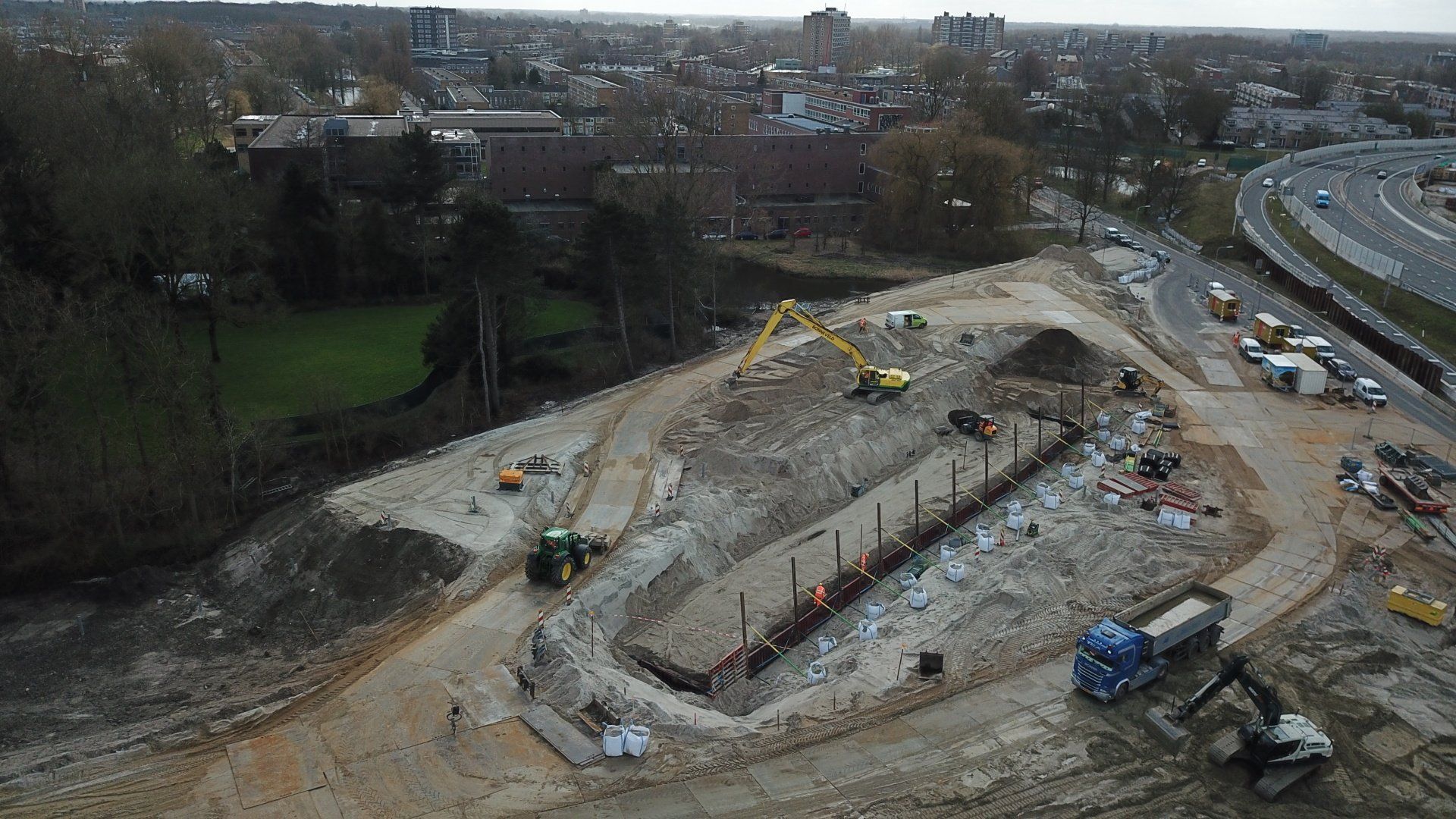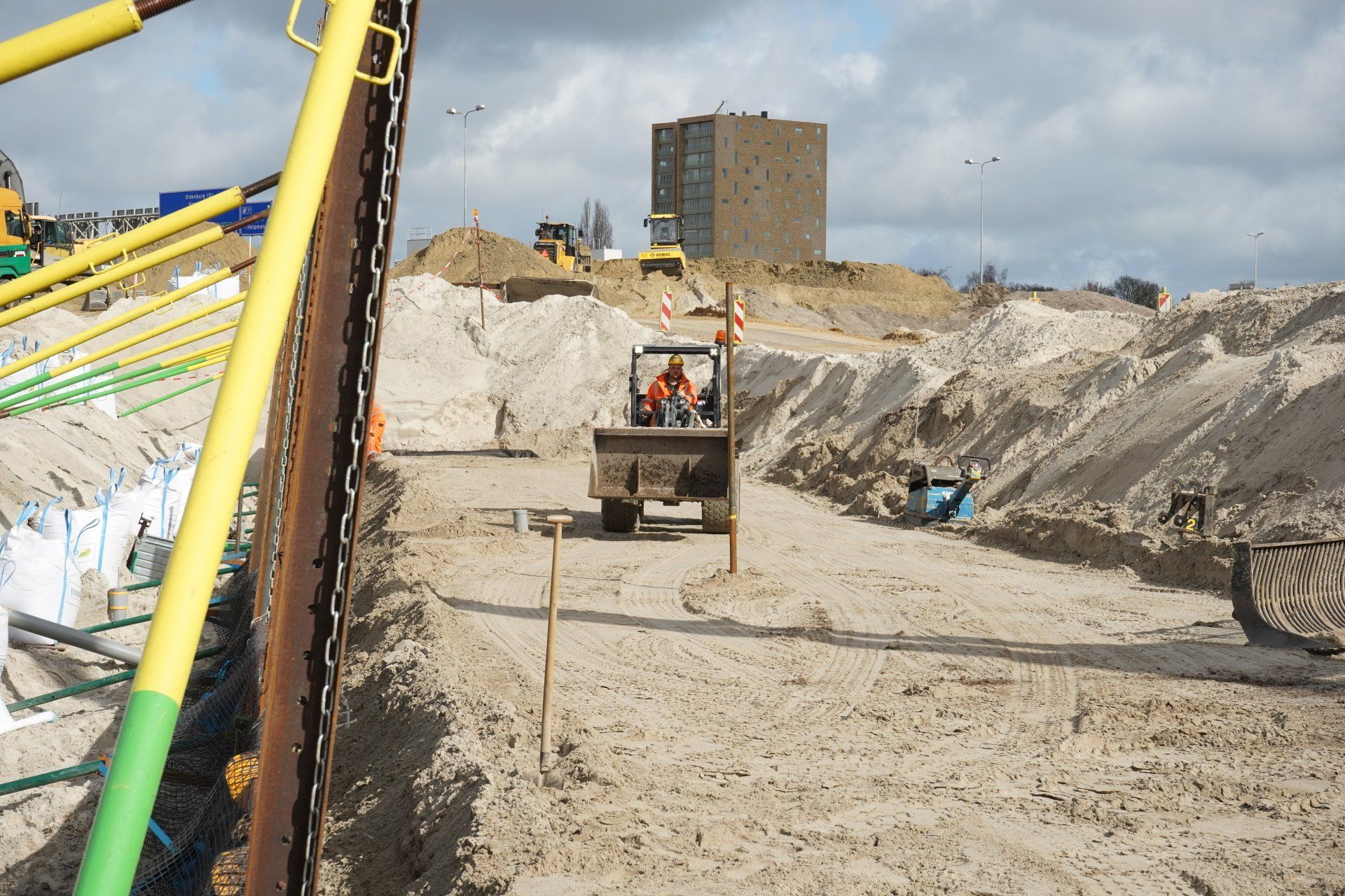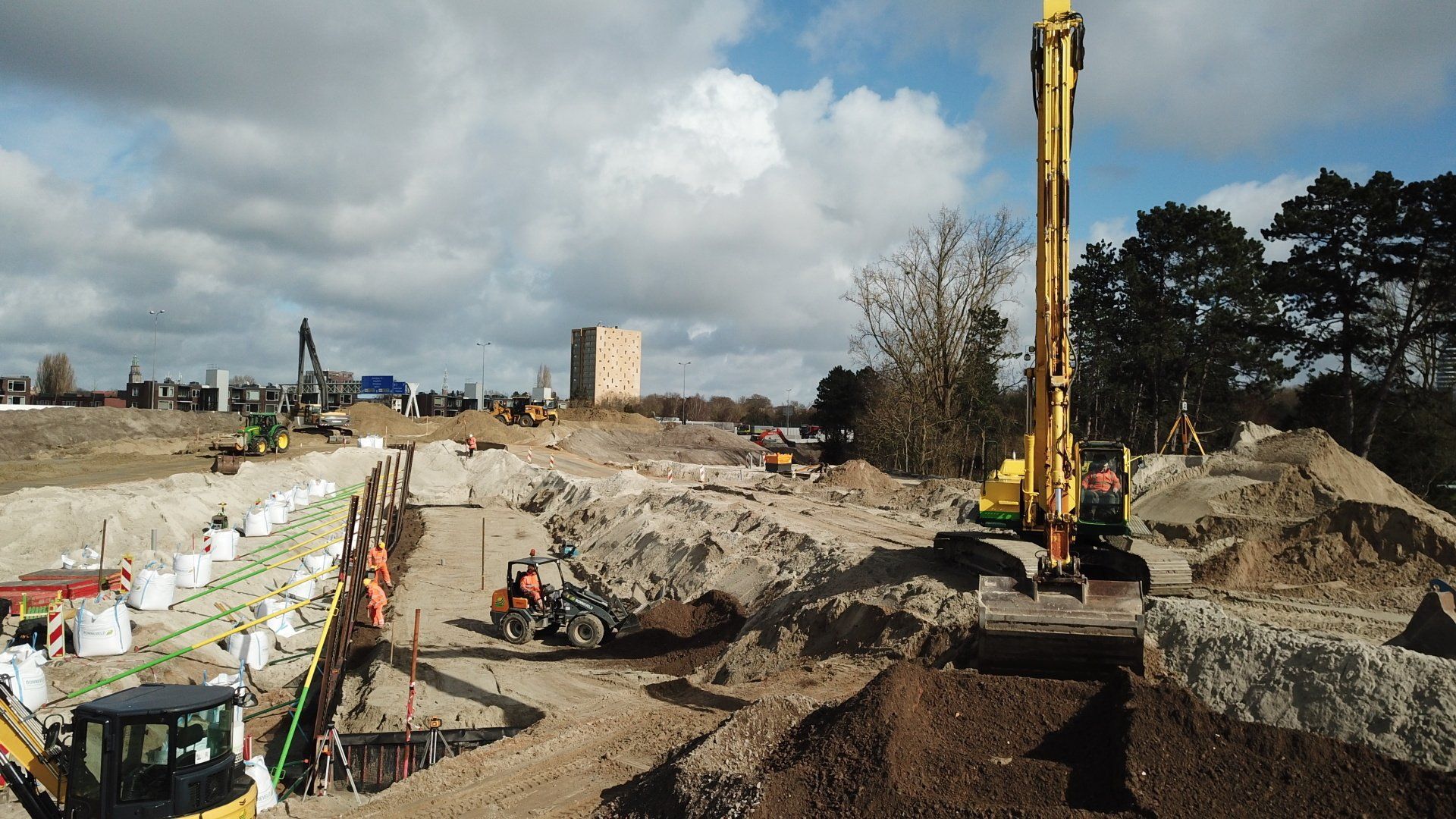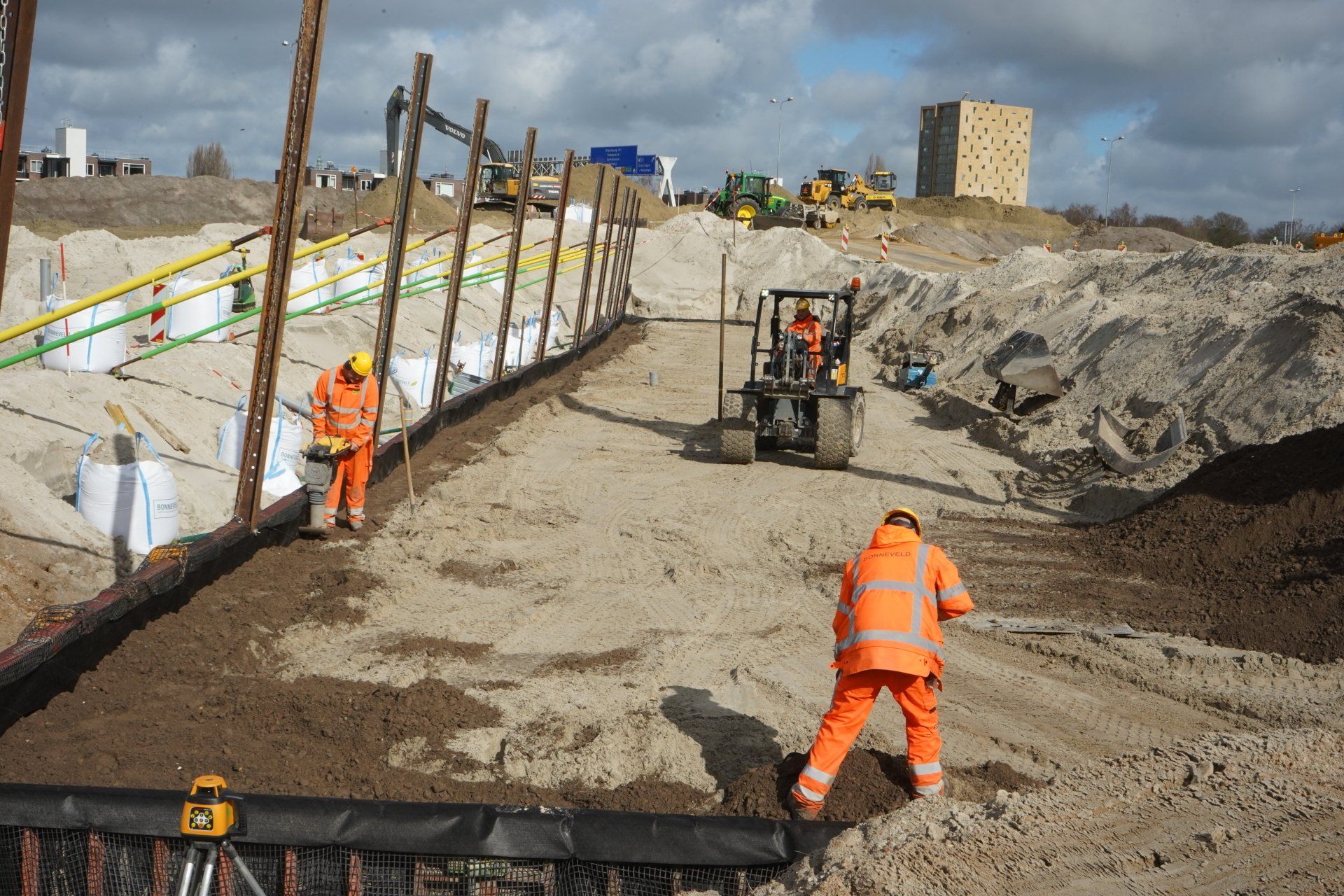 Werk met werk maken bij HIGH5 In Haarlem is gestart met de eerste fase van nieuwbouwproject HIGH5, onderdeel van gebiedsontwikkeling Schalkwijk Centrum. Bonneveld staat in voor de bouwplaatsinrichting en het ontgraven van de bouwkuip. Door een slimme fasering maakt de specialistisch grondwerker in de utiliteits- en infrabouw ‘werk met werk’ en blijft de aan- en afvoer van grondstoffen tot een minimum beperkt. HIGH5 is een ontwikkeling van HBB Groep en Hoorne Vastgoed , die gefaseerd vijf gebouwen realiseren, goed voor in totaal 569 appartementen. Voor HIGH5 hebben we nu het grondwerk van drie van de vijf gebouwen in opdracht en hebben reeds de bouwplaatsinrichting verzorgd en de toegang naar de bouwplaats gemaakt middels een grote overkluizing. Ook de bemaling valt binnen onze scope, zowel de freatische- als spanningsbemaling. Al met al voor ons dus een behoorlijk omvangrijk project. Overkluizing Rondom het bouwterrein bevindt zich een watergang. Voor een betere bereikbaarheid van het bouwterrein hebben we een overkluizing gemaakt tussen de Briandlaan en de Costa Del Sol. Daartoe hebben we begin oktober 2024 een onderheide constructie gemaakt, bestaande uit drie stalen duikerbuizen van 21 meter lang en 142 centimeter in doorsnede, gefundeerd op houten palen. Hierop is de verharding aangebracht in de vorm van 74 industrieplaten. De overkluizing zelf is met een breedte van 10 meter royaal bemeten en bedoeld voor bouwverkeer, calamiteitendiensten en bezoekers aan de sportschool in de tijdelijke huisvesting op het terrein. Het bouwverkeer wordt uiteraard gescheiden van het overige verkeer door betonnen barriers. Omvangrijke bouwplaatsinrichting Voor een vlakke en stofvrije bouwplaats heeft Bonneveld het terrein rondom vlak getrokken en afgedekt met in totaal ruim duizend industrieplaten. Aan de zijde van de Haarlemmervaart is tevens een tijdelijke damwand aangebracht en hebben we deze gedempt om voldoende werkruimte te creëren voor de realisatie van de woontorens. Verder hebben we een berlinerwand aangebracht zodat de aannemer na het ontgraven op een veilige manier de fundaties kan realiseren. Slim faseren De bouwkuip voor de eerste drie woontorens betreft een oppervlakte van een kleine 6.000 m2. Onze aanpak is erop gericht om grond zoveel mogelijk op locatie te houden. Grond wordt weliswaar op het bouwterrein verplaatst, maar later weer hergebruikt. Op die manier zijn we bijvoorbeeld in staat om de heilaag zo economisch mogelijk aan te brengen. Bij de eerste fase ontgraven we tussen de ruim 700 palen door met ons specialistische materieel uitgerust met GPS-apparatuur. Uiteindelijk moeten we 7.500 m3 grond afvoeren, maar wordt er twee keer zoveel ontgraven. Dat blijft dus allemaal op het project. Kwestie van slim plannen en faseren. Bonneveld is eind januari 2025 gestart met het ontgraven van de bouwput.
