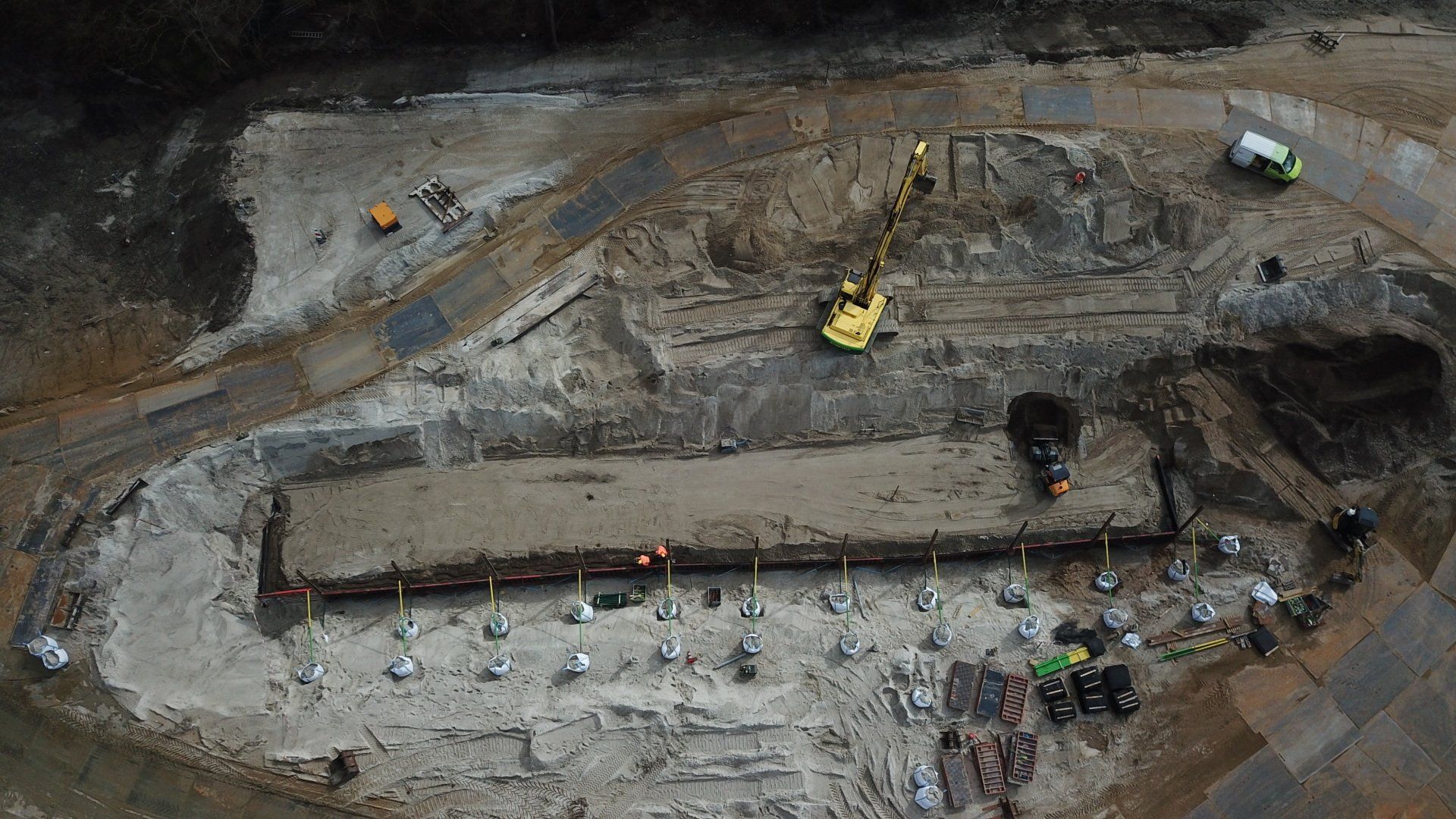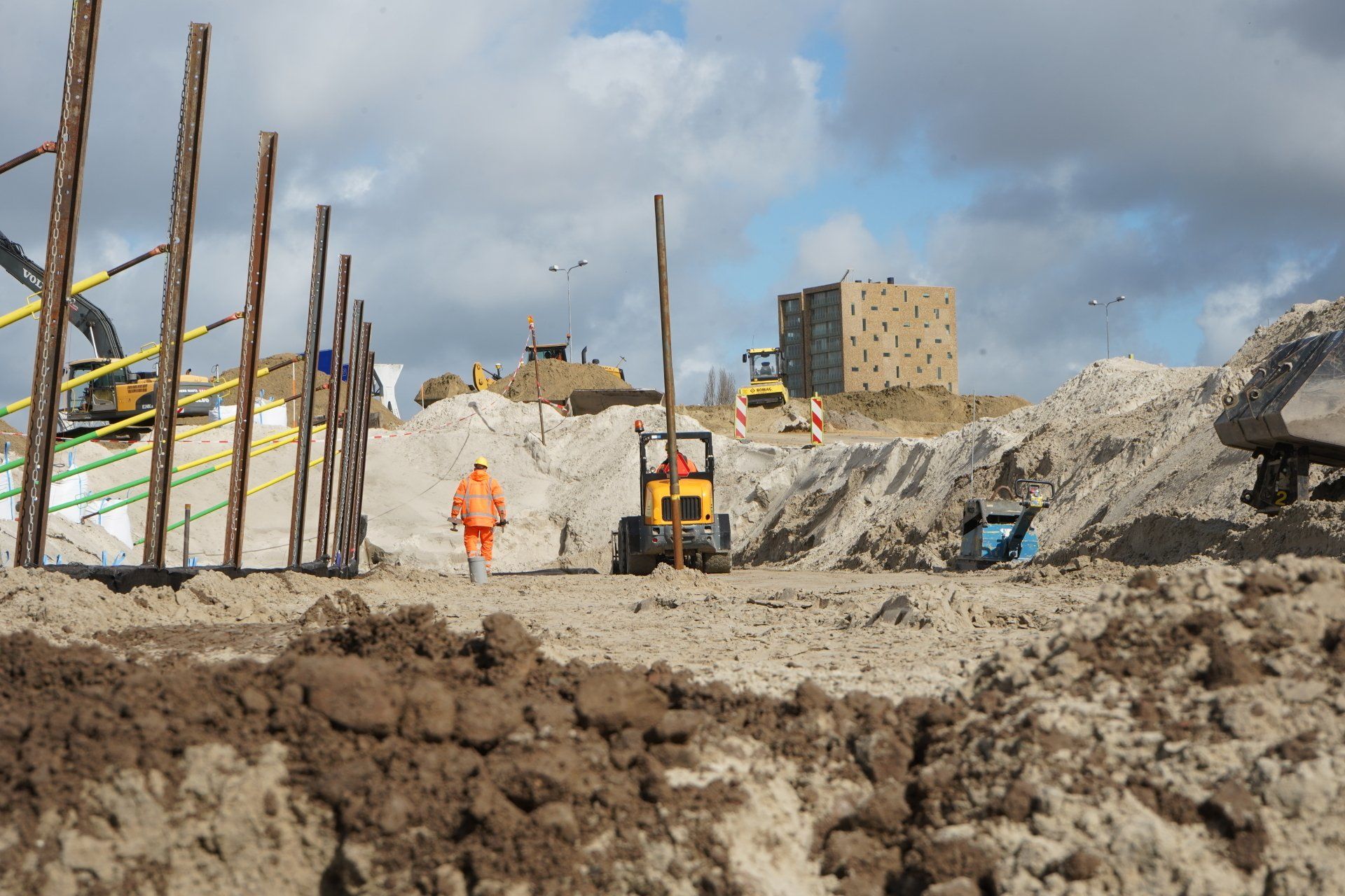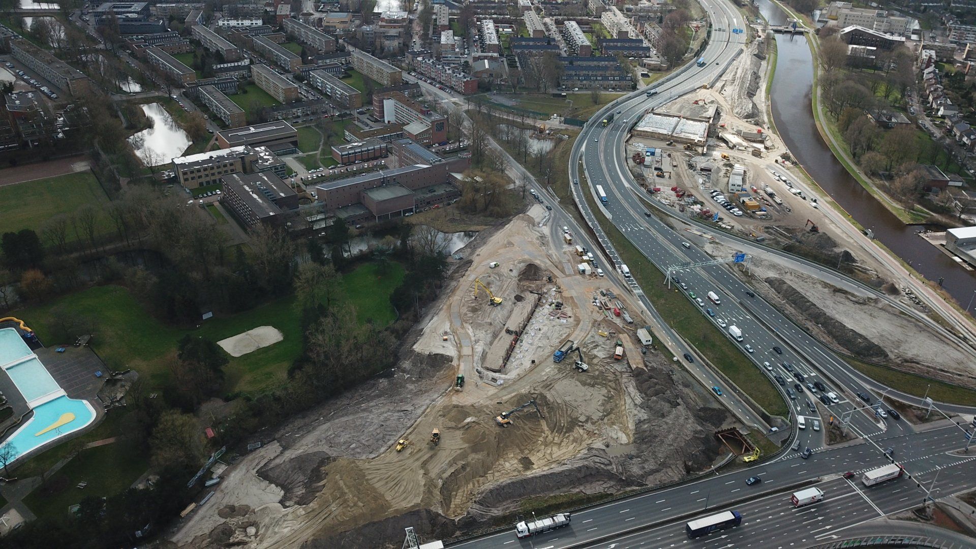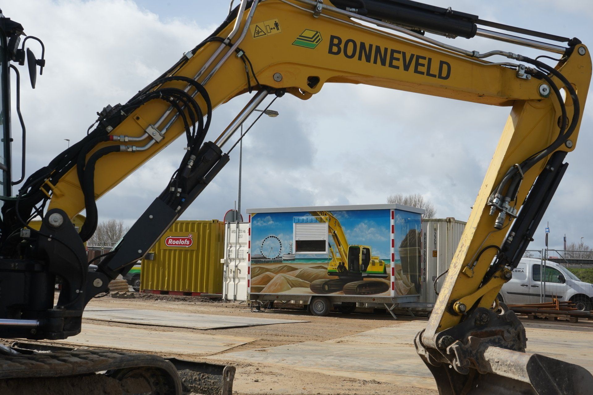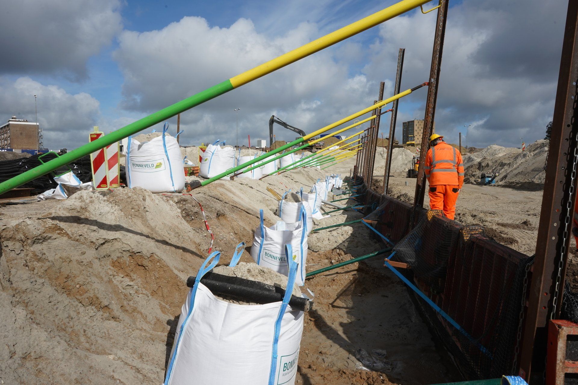 Werk met werk maken bij HIGH5 In Haarlem is gestart met de eerste fase van nieuwbouwproject HIGH5, onderdeel van gebiedsontwikkeling Schalkwijk Centrum. Bonneveld staat in voor de bouwplaatsinrichting en het ontgraven van de bouwkuip. Door een slimme fasering maakt de specialistisch grondwerker in de utiliteits- en infrabouw ‘werk met werk’ en blijft de aan- en afvoer van grondstoffen tot een minimum beperkt. HIGH5 is een ontwikkeling van HBB Groep en Hoorne Vastgoed , die gefaseerd vijf gebouwen realiseren, goed voor in totaal 569 appartementen. Voor HIGH5 hebben we nu het grondwerk van drie van de vijf gebouwen in opdracht en hebben reeds de bouwplaatsinrichting verzorgd en de toegang naar de bouwplaats gemaakt middels een grote overkluizing. Ook de bemaling valt binnen onze scope, zowel de freatische- als spanningsbemaling. Al met al voor ons dus een behoorlijk omvangrijk project. Overkluizing Rondom het bouwterrein bevindt zich een watergang. Voor een betere bereikbaarheid van het bouwterrein hebben we een overkluizing gemaakt tussen de Briandlaan en de Costa Del Sol. Daartoe hebben we begin oktober 2024 een onderheide constructie gemaakt, bestaande uit drie stalen duikerbuizen van 21 meter lang en 142 centimeter in doorsnede, gefundeerd op houten palen. Hierop is de verharding aangebracht in de vorm van 74 industrieplaten. De overkluizing zelf is met een breedte van 10 meter royaal bemeten en bedoeld voor bouwverkeer, calamiteitendiensten en bezoekers aan de sportschool in de tijdelijke huisvesting op het terrein. Het bouwverkeer wordt uiteraard gescheiden van het overige verkeer door betonnen barriers. Omvangrijke bouwplaatsinrichting Voor een vlakke en stofvrije bouwplaats heeft Bonneveld het terrein rondom vlak getrokken en afgedekt met in totaal ruim duizend industrieplaten. Aan de zijde van de Haarlemmervaart is tevens een tijdelijke damwand aangebracht en hebben we deze gedempt om voldoende werkruimte te creëren voor de realisatie van de woontorens. Verder hebben we een berlinerwand aangebracht zodat de aannemer na het ontgraven op een veilige manier de fundaties kan realiseren. Slim faseren De bouwkuip voor de eerste drie woontorens betreft een oppervlakte van een kleine 6.000 m2. Onze aanpak is erop gericht om grond zoveel mogelijk op locatie te houden. Grond wordt weliswaar op het bouwterrein verplaatst, maar later weer hergebruikt. Op die manier zijn we bijvoorbeeld in staat om de heilaag zo economisch mogelijk aan te brengen. Bij de eerste fase ontgraven we tussen de ruim 700 palen door met ons specialistische materieel uitgerust met GPS-apparatuur. Uiteindelijk moeten we 7.500 m3 grond afvoeren, maar wordt er twee keer zoveel ontgraven. Dat blijft dus allemaal op het project. Kwestie van slim plannen en faseren. Bonneveld is eind januari 2025 gestart met het ontgraven van de bouwput.