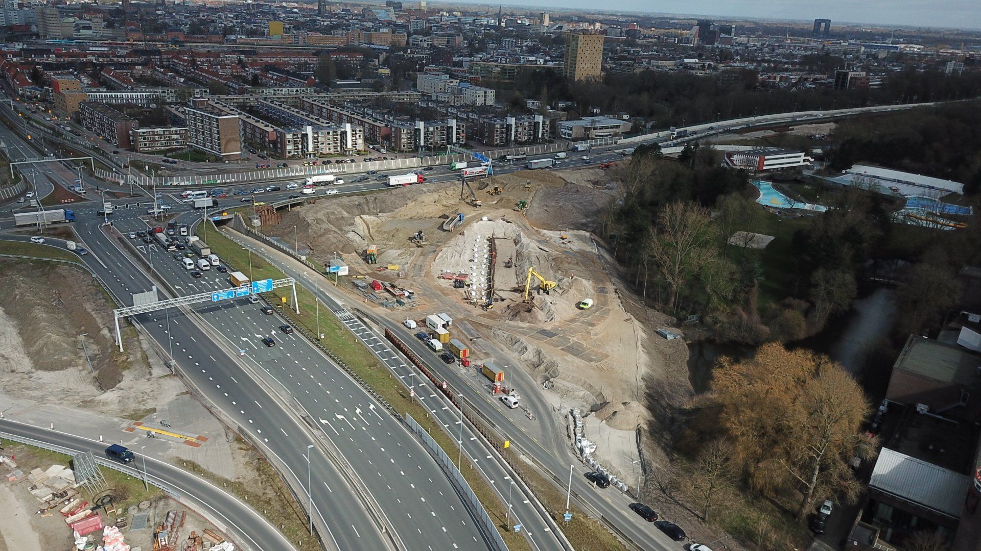 Betere doorstroming De reconstructie van knooppunt De Nieuwe Meer maakt deel uit van het programma Zuidasdok, één van de grootste infrastructurele projecten van Nederland. Dit programma heeft als doel de bereikbaarheid van Amsterdam en het noordelijke deel van de Randstad te verbeteren, zowel over de weg als met het openbaar vervoer. Met de herinrichting van het knooppunt de Nieuwe Meer door bouwcombinatie TriAX (Besix, Dura Vermeer en Heijmans) wordt de doorstroming en verkeersveiligheid in dit drukbezochte grootstedelijke gebied aanzienlijk verbeterd. Over een traject van circa twee kilometer – vanaf het knooppunt De Nieuwe Meer tot aan de aansluiting met de Amstelveenseweg – worden het knooppunt en de A10 Zuid volledig vernieuwd. In de nieuwe situatie wordt doorgaand verkeer op de A10 Zuid gescheiden van bestemmingsverkeer door de aanleg van een hoofd- en parallelstructuur. Deze sluit straks aan op de hoofd- en parallelstructuur van het project Tunnel Zuidasdok. Om dit mogelijk te maken, worden vier nieuwe beweegbare bruggen over de Schinkel gebouwd, de A10 Zuid verbreed en het onderliggend wegennet – waaronder de Amstelveenseweg – aangepast. Ook de bediening en besturing van de Schinkelbrug worden aangepast, zodat deze straks op afstand kan worden bediend. Paalmatrassen en gewapende grondconstructies De verbreding van de A10 is grotendeels gefundeerd op paalmatrassen en gewapende grondconstructies. Deze keuze was noodzakelijk omdat de snelweg op sommige plekken op slechts anderhalve meter afstand ligt van iconische gebouwen als Infinity, beter bekend als ‘De Schoen’ en Tripolis. Hierdoor was het niet mogelijk om een traditionele voorbelasting aan te brengen om zettingen in de ondergrond vooraf te realiseren. Om de ondergrond te ontlasten, worden paalmatrassen toegepast. Daarbovenop wordt de ophoging uitgevoerd met gewapende grondconstructies en keerwanden. Onze rol als Bonneveld Gewapende Grondconstructies BV In opdracht van bouwcombinatie TriAX is Bonneveld Gewapende Grondconstructies BV mede verantwoordelijk voor de uitwerking van het ontwerp, de levering en de uitvoering van in totaal acht definitieve en vijf tijdelijke constructies. Deze bestaan uit paalmatrassen, gewapende grondconstructies en combinaties daarvan. Onze betrokkenheid bij het project begon in 2022, tijdens de tenderfase, en liep daarna door in de voorbereidingsfase. Het ontwerp van TriAX is mede uitgewerkt door Joosten Concepts , een samenwerkingsverband tussen Joosten, Geologics en Bonneveld . Deze samenwerking, actief sinds 2021, heeft zich al bewezen op diverse grote infraprojecten zoals Groningen Ring-Zuid , RijnlandRoute , de nieuw e A16 , A9 BaHo en meerdere regionale projecten. Dankzij deze gezamenlijke ervaring weten we precies wat we aan elkaar hebben en kunnen we in het ontwerpproces eenvoudiger tot optimalisaties komen. De korte communicatielijnen binnen Joosten Concepts zorgen bovendien voor praktische, uitvoerbare ontwerpen waarin al vroeg rekening wordt gehouden met de uitvoering. Door al in de ontwerpfase intensief samen te werken met TriAX, kunnen we de uitvoerbaarheid waarborgen en kansen en risico’s vroegtijdig signaleren. Na een grondige voorbereiding zijn we in 2024 gestart met de tijdelijke gewapend e grondconstructies voo r de bypass. In 2025 volgden de eerste definitieve constructies. De omvang van het project, de beperkte werkruimte en de complexe fasering maken het tot een technische uitdaging. Dit vraagt om slimme oplossingen in zowel ontwerp als uitvoering. Samen met onze werkplaats hebben we hulpmaterialen geoptimaliseerd om de werkzaamheden binnen de beperkte ruimte efficiënt uit te voeren. Door deze uitdagingen aan te gaan, hebben we als organisatie een nog hoger niveau van vakmanschap en samenwerking bereikt, een ervaring die ons sterker maakt voor toekomstige projecten. Tot medio 2026 werken we in een continue bouwstroom, waarbij steeds minimaal twee grondconstructies gelijktijdig worden opgebouwd. Samen sterk met Bonneveld Aannemingsbedrijf BV Dankzij het moderne en veelzijdige machinepark van Bonneveld Aannemingsbedrijf BV kunnen wij voor iedere constructie het meest geschikte materieel inzetten. De nauwe samenwerking tussen beide bedrijven zorgt voor flexibiliteit, efficiëntie en duidelijke meerwaarde voor onze opdrachtgever. Naast materieel delen we ook kennis en ervaring op het gebied van grondverzet en uitvoering. Zo denken we actief mee over optimalisaties die verder gaan dan het leveren en aanbrengen van constructies. Voor dit project hebben we onder meer stalen buispalen van een combiwand leeggeknepen en betonietmatten aangebracht – een mooi voorbeeld van onze brede inzetbaarheid en oplossingsgerichte aanpak. Trots op onze bijdrage Wij zijn trots om als partner van TriAX onderdeel te zijn van dit indrukwekkende project. Voor Bonneveld is dit bovendien het grootste project tot nu toe – een mijlpaal waar we met ons hele team met recht trots op zijn.