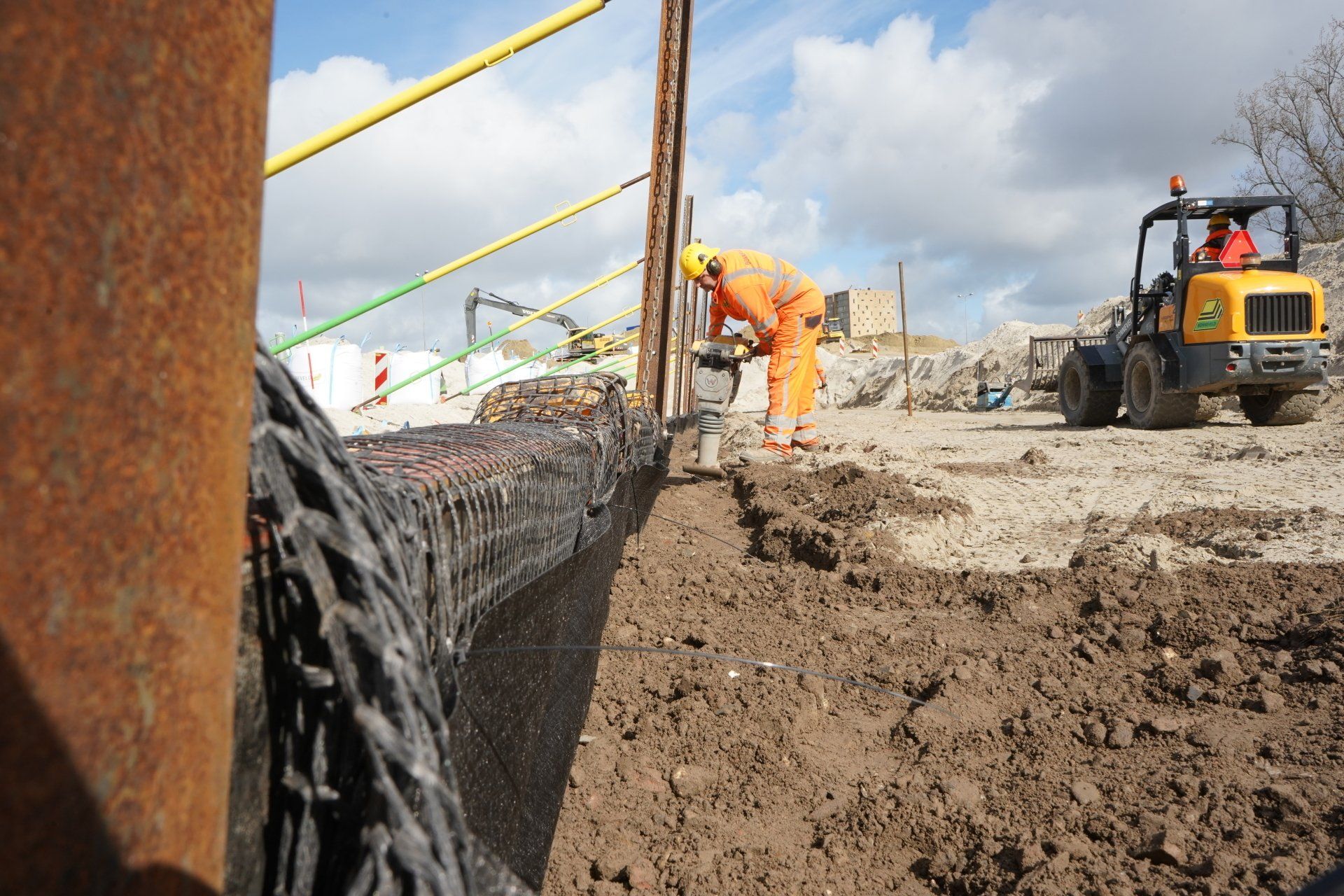 De Silo’s op Zeeburgereiland krijgen een nieuwe bestemming. Van industrieel erfgoed naar een levendige ontmoetingsplek met cultuur, horeca en een groen dakpark, Hier komt modern design samen in een duurzame toekomst. In opdracht van Vink Bouw mochten we de grondwerkzaamheden en de bouwplaatsinrichting verzorgen van de transformatie van de drie voormalige waterzuiveringssilo’s. Onderdeel van de bouwplaatsinrichting is de tijdelijke demping van een watergang om zo voldoende bouwterrein beschikbaar te maken. De transformatie van de silo’s is een project met hoge duurzaamheidsambities. Het ontwerpcertificaat BREEAM Outstanding is al binnen en ook de uitvoering ligt langs een strenge duurzaamheidslat. En Bonneveld draagt daar letterlijk en figuurlijk haar steentje aan bij, Een deel van het puingranulaat is afkomstig van een breker in de buurt, een belangrijk deel is afkomstig uit Delft van een ander werk van Vink Bouw. Aan het einde van de rit gaan we de bouwplaats weer opruimen. Puingranulaat gaat dan weer door naar een andere bouwplaats, en als daar geen plek voor is, naar de breker. Vloerplaten die goed genoeg zijn, gebruiken we ook zo lang mogelijk door. Is de bouwkeet weg dan zullen we als laatste werk de watergang terugbrengen in oude staat en met de grond het bouwterrein opvullen.
