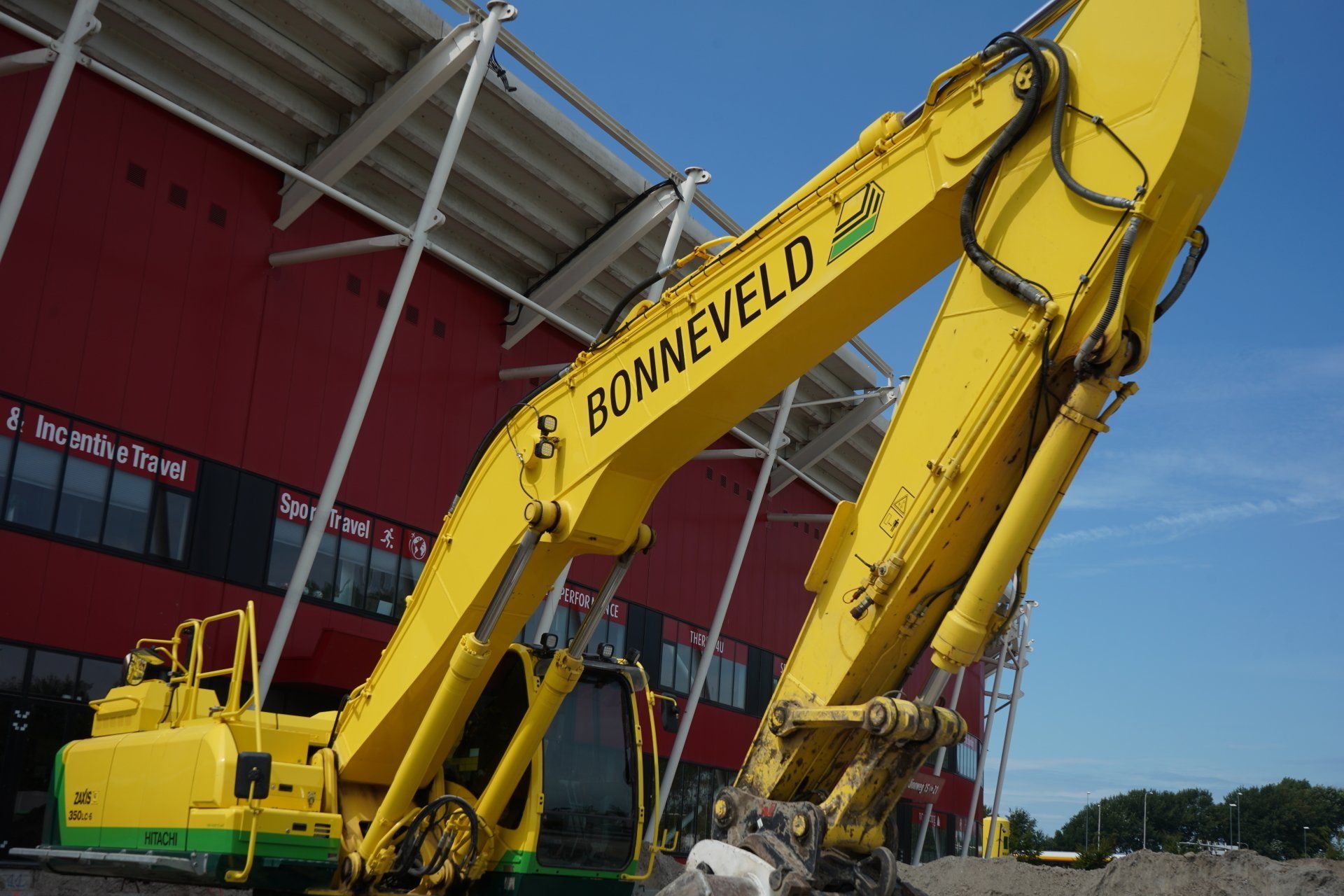 Werk met werk maken bij HIGH5 In Haarlem is gestart met de eerste fase van nieuwbouwproject HIGH5, onderdeel van gebiedsontwikkeling Schalkwijk Centrum. Bonneveld staat in voor de bouwplaatsinrichting en het ontgraven van de bouwkuip. Door een slimme fasering maakt de specialistisch grondwerker in de utiliteits- en infrabouw ‘werk met werk’ en blijft de aan- en afvoer van grondstoffen tot een minimum beperkt. HIGH5 is een ontwikkeling van HBB Groep en Hoorne Vastgoed , die gefaseerd vijf gebouwen realiseren, goed voor in totaal 569 appartementen. Voor HIGH5 hebben we nu het grondwerk van drie van de vijf gebouwen in opdracht en hebben reeds de bouwplaatsinrichting verzorgd en de toegang naar de bouwplaats gemaakt middels een grote overkluizing. Ook de bemaling valt binnen onze scope, zowel de freatische- als spanningsbemaling. Al met al voor ons dus een behoorlijk omvangrijk project. Overkluizing Rondom het bouwterrein bevindt zich een watergang. Voor een betere bereikbaarheid van het bouwterrein hebben we een overkluizing gemaakt tussen de Briandlaan en de Costa Del Sol. Daartoe hebben we begin oktober 2024 een onderheide constructie gemaakt, bestaande uit drie stalen duikerbuizen van 21 meter lang en 142 centimeter in doorsnede, gefundeerd op houten palen. Hierop is de verharding aangebracht in de vorm van 74 industrieplaten. De overkluizing zelf is met een breedte van 10 meter royaal bemeten en bedoeld voor bouwverkeer, calamiteitendiensten en bezoekers aan de sportschool in de tijdelijke huisvesting op het terrein. Het bouwverkeer wordt uiteraard gescheiden van het overige verkeer door betonnen barriers. Omvangrijke bouwplaatsinrichting Voor een vlakke en stofvrije bouwplaats heeft Bonneveld het terrein rondom vlak getrokken en afgedekt met in totaal ruim duizend industrieplaten. Aan de zijde van de Haarlemmervaart is tevens een tijdelijke damwand aangebracht en hebben we deze gedempt om voldoende werkruimte te creëren voor de realisatie van de woontorens. Verder hebben we een berlinerwand aangebracht zodat de aannemer na het ontgraven op een veilige manier de fundaties kan realiseren. Slim faseren De bouwkuip voor de eerste drie woontorens betreft een oppervlakte van een kleine 6.000 m2. Onze aanpak is erop gericht om grond zoveel mogelijk op locatie te houden. Grond wordt weliswaar op het bouwterrein verplaatst, maar later weer hergebruikt. Op die manier zijn we bijvoorbeeld in staat om de heilaag zo economisch mogelijk aan te brengen. Bij de eerste fase ontgraven we tussen de ruim 700 palen door met ons specialistische materieel uitgerust met GPS-apparatuur. Uiteindelijk moeten we 7.500 m3 grond afvoeren, maar wordt er twee keer zoveel ontgraven. Dat blijft dus allemaal op het project. Kwestie van slim plannen en faseren. Bonneveld is eind januari 2025 gestart met het ontgraven van de bouwput.