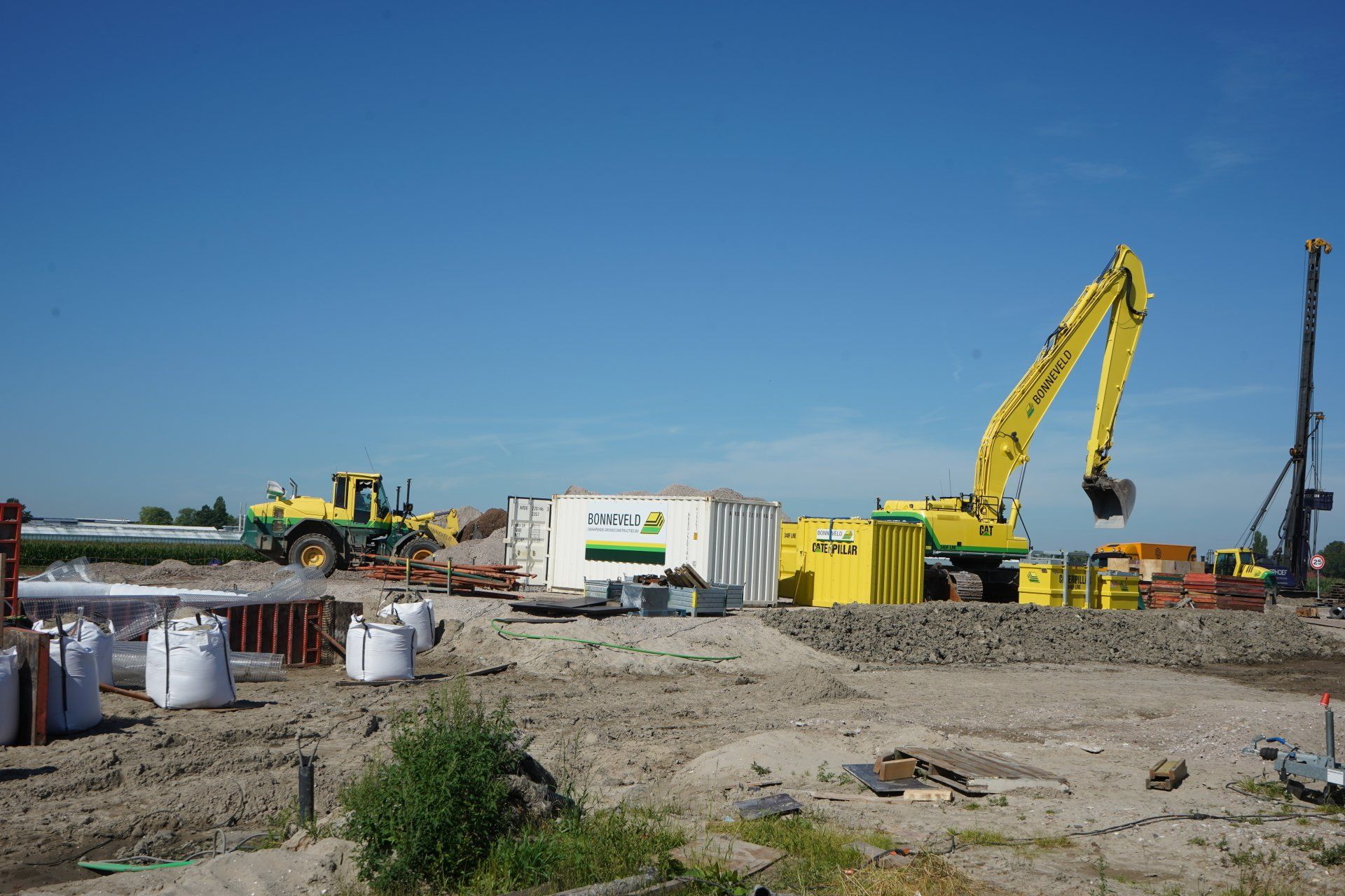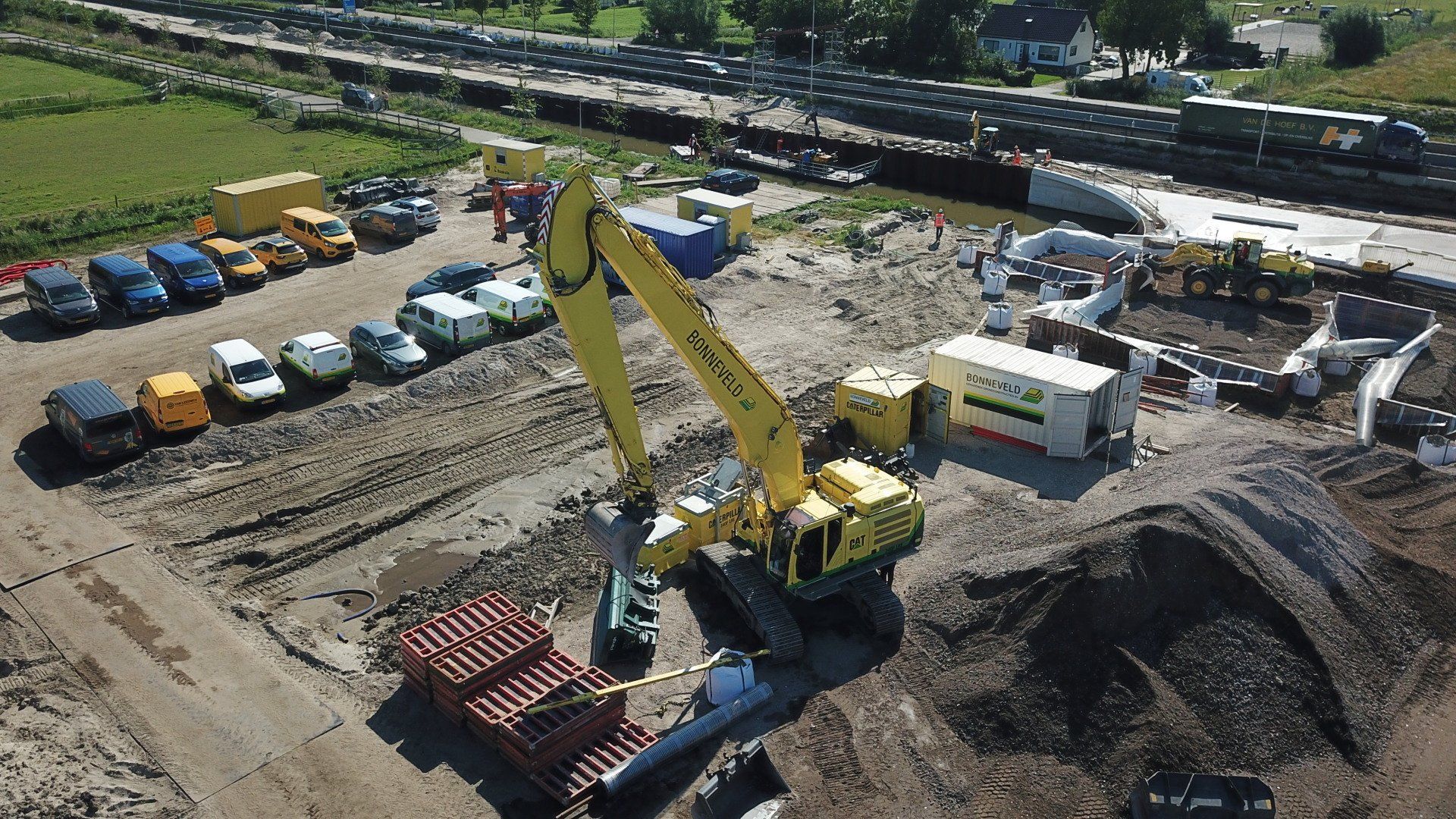 Werk met werk maken bij HIGH5 In Haarlem is gestart met de eerste fase van nieuwbouwproject HIGH5, onderdeel van gebiedsontwikkeling Schalkwijk Centrum. Bonneveld staat in voor de bouwplaatsinrichting en het ontgraven van de bouwkuip. Door een slimme fasering maakt de specialistisch grondwerker in de utiliteits- en infrabouw ‘werk met werk’ en blijft de aan- en afvoer van grondstoffen tot een minimum beperkt. HIGH5 is een ontwikkeling van HBB Groep en Hoorne Vastgoed , die gefaseerd vijf gebouwen realiseren, goed voor in totaal 569 appartementen. Voor HIGH5 hebben we nu het grondwerk van drie van de vijf gebouwen in opdracht en hebben reeds de bouwplaatsinrichting verzorgd en de toegang naar de bouwplaats gemaakt middels een grote overkluizing. Ook de bemaling valt binnen onze scope, zowel de freatische- als spanningsbemaling. Al met al voor ons dus een behoorlijk omvangrijk project. Overkluizing Rondom het bouwterrein bevindt zich een watergang. Voor een betere bereikbaarheid van het bouwterrein hebben we een overkluizing gemaakt tussen de Briandlaan en de Costa Del Sol. Daartoe hebben we begin oktober 2024 een onderheide constructie gemaakt, bestaande uit drie stalen duikerbuizen van 21 meter lang en 142 centimeter in doorsnede, gefundeerd op houten palen. Hierop is de verharding aangebracht in de vorm van 74 industrieplaten. De overkluizing zelf is met een breedte van 10 meter royaal bemeten en bedoeld voor bouwverkeer, calamiteitendiensten en bezoekers aan de sportschool in de tijdelijke huisvesting op het terrein. Het bouwverkeer wordt uiteraard gescheiden van het overige verkeer door betonnen barriers. Omvangrijke bouwplaatsinrichting Voor een vlakke en stofvrije bouwplaats heeft Bonneveld het terrein rondom vlak getrokken en afgedekt met in totaal ruim duizend industrieplaten. Aan de zijde van de Haarlemmervaart is tevens een tijdelijke damwand aangebracht en hebben we deze gedempt om voldoende werkruimte te creëren voor de realisatie van de woontorens. Verder hebben we een berlinerwand aangebracht zodat de aannemer na het ontgraven op een veilige manier de fundaties kan realiseren. Slim faseren De bouwkuip voor de eerste drie woontorens betreft een oppervlakte van een kleine 6.000 m2. Onze aanpak is erop gericht om grond zoveel mogelijk op locatie te houden. Grond wordt weliswaar op het bouwterrein verplaatst, maar later weer hergebruikt. Op die manier zijn we bijvoorbeeld in staat om de heilaag zo economisch mogelijk aan te brengen. Bij de eerste fase ontgraven we tussen de ruim 700 palen door met ons specialistische materieel uitgerust met GPS-apparatuur. Uiteindelijk moeten we 7.500 m3 grond afvoeren, maar wordt er twee keer zoveel ontgraven. Dat blijft dus allemaal op het project. Kwestie van slim plannen en faseren. Bonneveld is eind januari 2025 gestart met het ontgraven van de bouwput.