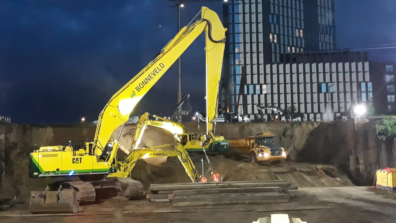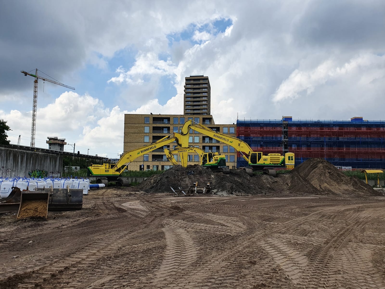 Werk met werk maken bij HIGH5 In Haarlem is gestart met de eerste fase van nieuwbouwproject HIGH5, onderdeel van gebiedsontwikkeling Schalkwijk Centrum. Bonneveld staat in voor de bouwplaatsinrichting en het ontgraven van de bouwkuip. Door een slimme fasering maakt de specialistisch grondwerker in de utiliteits- en infrabouw ‘werk met werk’ en blijft de aan- en afvoer van grondstoffen tot een minimum beperkt. HIGH5 is een ontwikkeling van HBB Groep en Hoorne Vastgoed , die gefaseerd vijf gebouwen realiseren, goed voor in totaal 569 appartementen. Voor HIGH5 hebben we nu het grondwerk van drie van de vijf gebouwen in opdracht en hebben reeds de bouwplaatsinrichting verzorgd en de toegang naar de bouwplaats gemaakt middels een grote overkluizing. Ook de bemaling valt binnen onze scope, zowel de freatische- als spanningsbemaling. Al met al voor ons dus een behoorlijk omvangrijk project. Overkluizing Rondom het bouwterrein bevindt zich een watergang. Voor een betere bereikbaarheid van het bouwterrein hebben we een overkluizing gemaakt tussen de Briandlaan en de Costa Del Sol. Daartoe hebben we begin oktober 2024 een onderheide constructie gemaakt, bestaande uit drie stalen duikerbuizen van 21 meter lang en 142 centimeter in doorsnede, gefundeerd op houten palen. Hierop is de verharding aangebracht in de vorm van 74 industrieplaten. De overkluizing zelf is met een breedte van 10 meter royaal bemeten en bedoeld voor bouwverkeer, calamiteitendiensten en bezoekers aan de sportschool in de tijdelijke huisvesting op het terrein. Het bouwverkeer wordt uiteraard gescheiden van het overige verkeer door betonnen barriers. Omvangrijke bouwplaatsinrichting Voor een vlakke en stofvrije bouwplaats heeft Bonneveld het terrein rondom vlak getrokken en afgedekt met in totaal ruim duizend industrieplaten. Aan de zijde van de Haarlemmervaart is tevens een tijdelijke damwand aangebracht en hebben we deze gedempt om voldoende werkruimte te creëren voor de realisatie van de woontorens. Verder hebben we een berlinerwand aangebracht zodat de aannemer na het ontgraven op een veilige manier de fundaties kan realiseren. Slim faseren De bouwkuip voor de eerste drie woontorens betreft een oppervlakte van een kleine 6.000 m2. Onze aanpak is erop gericht om grond zoveel mogelijk op locatie te houden. Grond wordt weliswaar op het bouwterrein verplaatst, maar later weer hergebruikt. Op die manier zijn we bijvoorbeeld in staat om de heilaag zo economisch mogelijk aan te brengen. Bij de eerste fase ontgraven we tussen de ruim 700 palen door met ons specialistische materieel uitgerust met GPS-apparatuur. Uiteindelijk moeten we 7.500 m3 grond afvoeren, maar wordt er twee keer zoveel ontgraven. Dat blijft dus allemaal op het project. Kwestie van slim plannen en faseren. Bonneveld is eind januari 2025 gestart met het ontgraven van de bouwput.